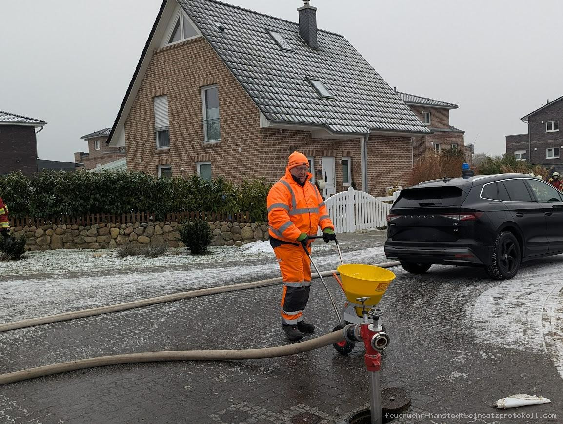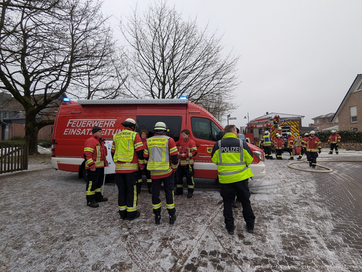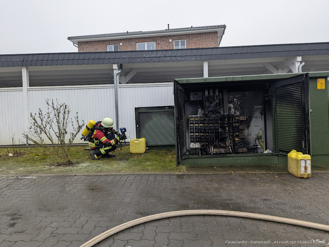 (jwu) Asendorf. Am heutigen Sonntagvormittag gegen 10:32 Uhr wurden die Freiwilligen Feuerwehren Asendorf, Hanstedt, Dierkshausen und im späteren Einsatzverlauf die Freiwillige Feuerwehr Marxen wegen einer Rauchentwicklung an einer örtlichen Trafostation alarmiert. Die Anlage, die für die Transformation von 20.000 Volt auf 400 Volt zuständig ist, geriet in Brand. Beim Eintreffen der ersten Kräfte drang Qualm aus der Umspannstation. Da die Sta-tion direkt an einen Carport angrenzt, errichtete die Feuerwehr unter der Leitung des Gemeindebrandmeister Sebastian Seier umgehend eine Riegelstellung als Vorsichts-maßnahme. Damit wurde ein potenzielles Übergreifen von Hitze oder Flammen auf das Nachbargrundstück effektiv verhindert. Nachdem der Netzbetreiber EWE NETZ die Station freigeschaltet hatte, gingen meh-rere Trupps unter Umluftunabhängigem Atemschutz vor, um das Innere der Station gezielt herunterzukühlen. Trotz des schnellen Eingreifens der 60 Einsatzkräfte brannte die technische Einrichtung der Station vollständig aus. Die eisigen Temperaturen führten dazu, dass das eingesetzte Löschwasser auf der Straße sofort gefror. Um die Si-cherheit an der Einsatzstelle nicht zu gefährden, rückte der Bauhof der Samtgemeinde Hanstedt an und sicherte die glatten Verkehrsflächen mit Streusalz ab. Ein besonderer Fokus der Einsatzkräfte lag auf der Sicherheit der Anwohner. Einsatzkräfte der Feuerwehr gingen die betroffenen Haushalte gezielt ab, um die Bürger persönlich über die Lage zu informieren. Dabei wurde explizit geprüft, ob Personen in den Haushalten auf medizinische Geräte angewiesen sind, die eine konstante Stromversorgung benötigen. Vom Stromausfall waren etwa 70 Haushalte und damit rund 250 Personen betroffen. Um eine Anlaufstelle im Warmen zu bieten, richteten die Gemeinde Asendorf und die Samtgemeinde Hanstedt im Dorfgemeinschaftshaus einen sogenannten Leuchtturm ein. Unter der Leitung von Ortsbürgermeister Rainer Mencke und Samtgemeindebürgermeister Olaf Muus wurden die Bürger dort über die Lage informiert und mit warmen Getränken versorgt. Die Reparaturarbeiten der EWE NETZ dauerten bis 18:00 Uhr an. Um die Zeit bis zur vollständigen Instandsetzung zu überbrücken, stellte die EWE NETZ die Versorgung der betroffenen Haushalte über eine provisorische Stromversorgung sicher. Die Ursa-che für die Entstehung des Brandes ist bislang ungeklärt.
